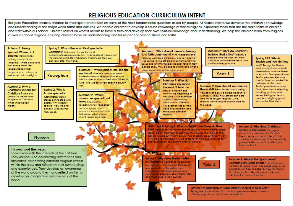 At Maple Infants’ School we aim to deliver high quality RE provision which ensures that children develop their knowledge and understanding of the major world faiths and cultures from an early age, helping them to explore what people believe and what difference this makes to how they live. This helps our children to develop an understanding and respect of cultures and faiths. Our RE curriculum makes a significant contribution to children’s spiritual, moral, social and cultural development, as well as providing important opportunities to promote and explore our British Values.