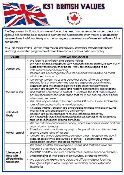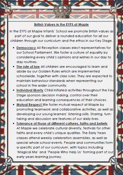At Maple Infants' School we take our responsibility very seriously, to prepare children for life in modern Britain. We ensure that the fundamental British values of democracy, rule of law, individual liberty, mutual respect and tolerance for those with different faiths and beliefs are actively promoted throughout our school.